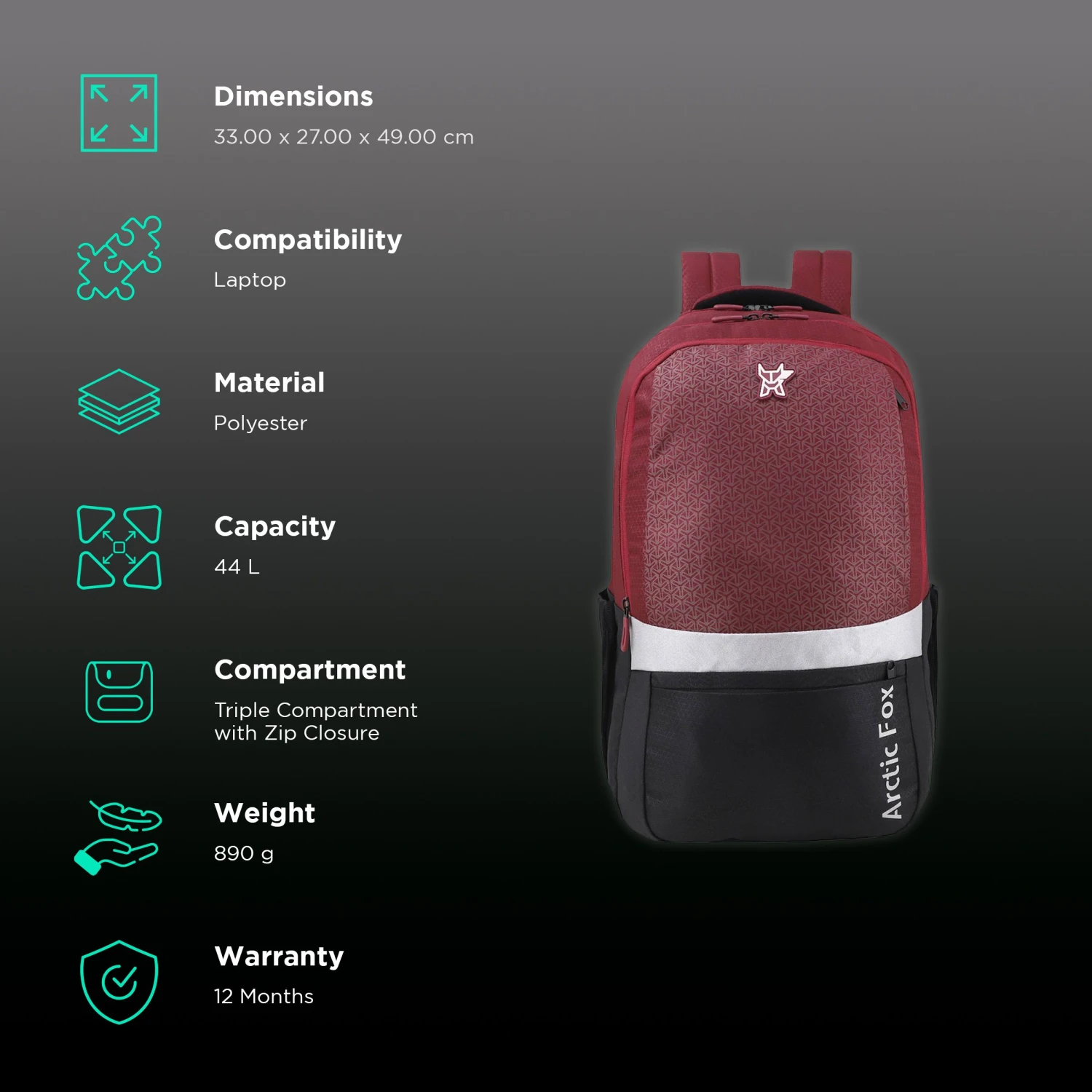 Be the first to review “Arctic Fox Merit 44 Litres Polyester Backpack (FTEBPKTPOWW062044, Tawny Port)” Cancel reply