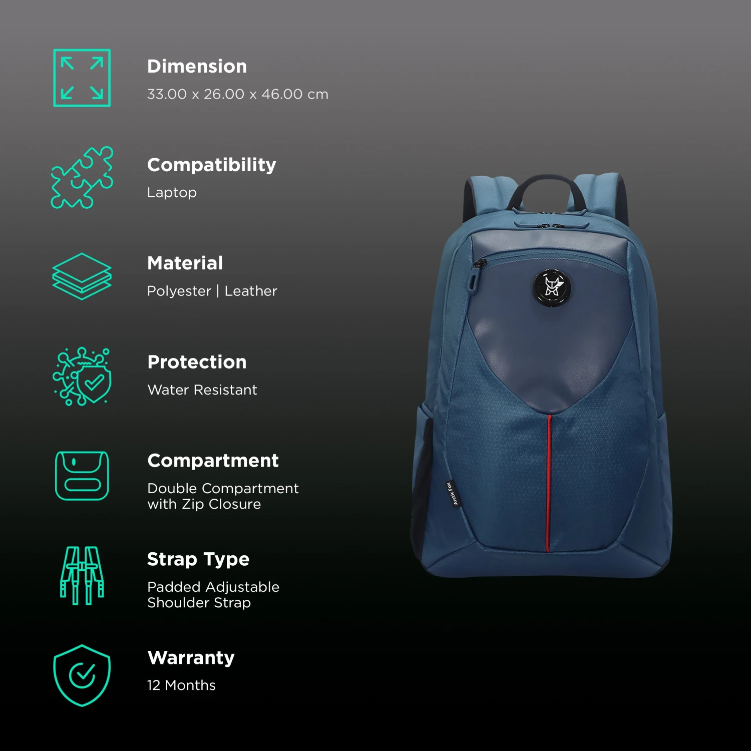 Be the first to review “Arctic Fox Shield Polyester, Leather Laptop Backpack For 15 Inch Laptop (30 L, Water Resistant, Deep Dive)” Cancel reply