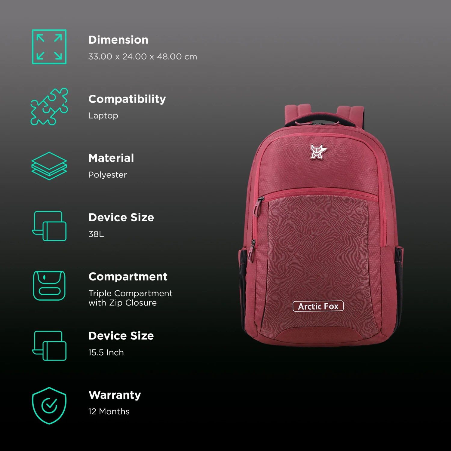 Be the first to review “Arctic Fox Trace Polyester Laptop Backpack For 15.5 Inch Laptop (38 L, With Rain Cover, Tawny Port)” Cancel reply