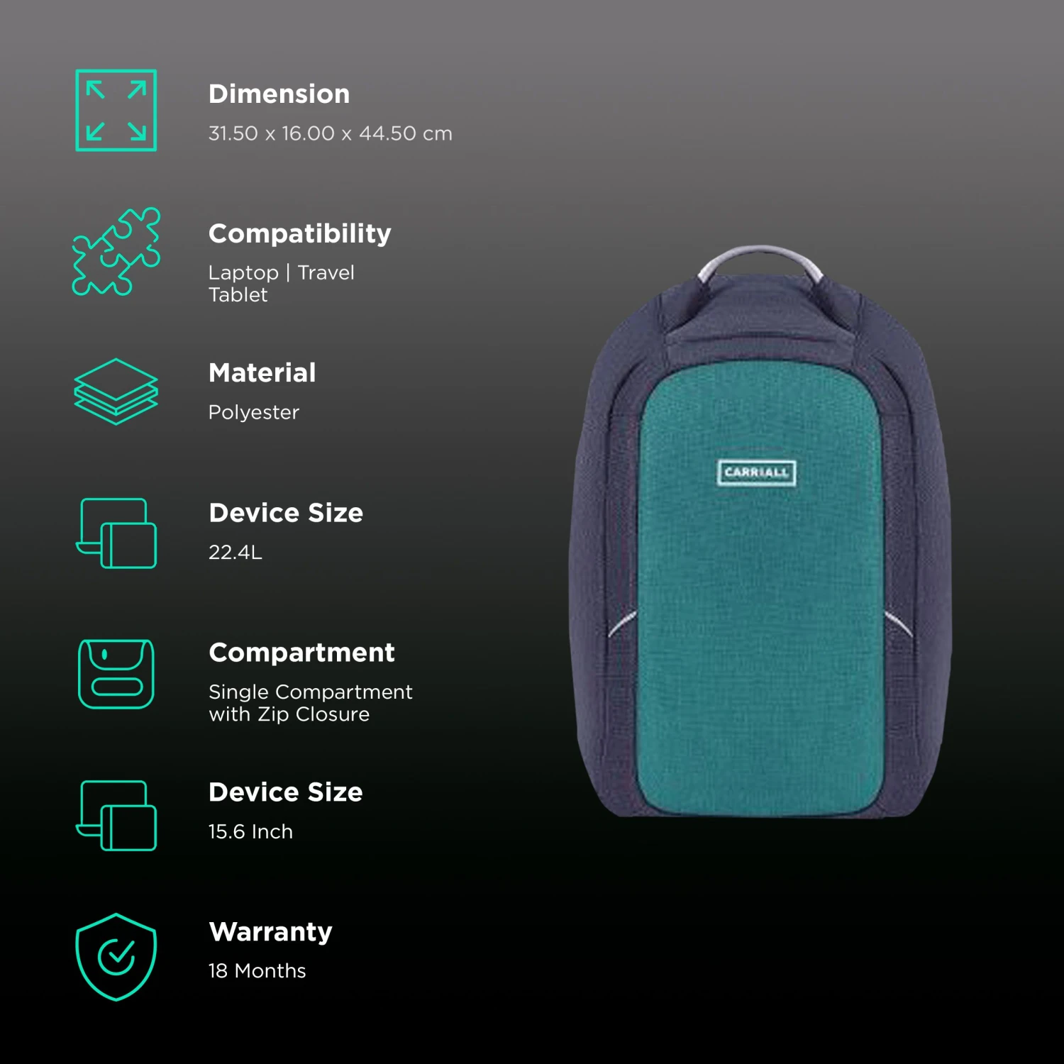 Be the first to review “Carriall Columbus Polyester Laptop Backpack For 15.6 Inch Laptop (22.4 L, USB Charging Port, Green)” Cancel reply